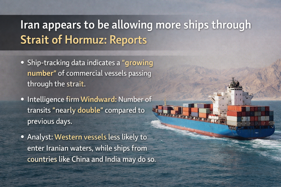 “Iran appears to be allowing a small but increasing number of commercial ships to pass through the Strait of Hormuz, according to ship-tracking data.